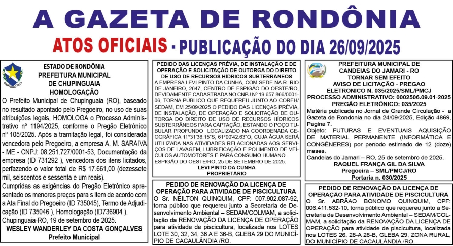 A GAZETA DE RONDÔNIA ATOS OFICIAIS PUBLICAÇÃO DO DIA 26/09/2025 Por Diretor Chefe 25 de setembro de 2025 às 18h10