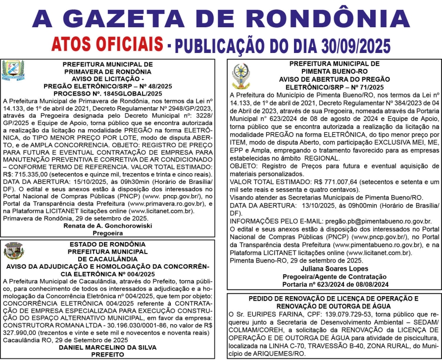A GAZETA DE RONDÔNIA ATOS OFICIAIS PUBLICAÇÃO DO DIA 30/09/2025 Por Diretor Chefe 30 de setembro de 2025 às 07h29