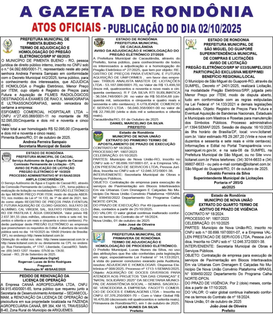 A GAZETA DE RONDÔNIA ATOS OFICIAIS PUBLICAÇÃO DO DIA 02/10/2025 Por Diretor Chefe 2 de outubro de 2025 às 07h00