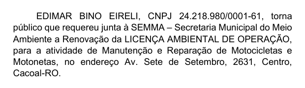 EDIMAR BINO EIREL LICENÇA AMBIENTAL DE OPERAÇÃO,