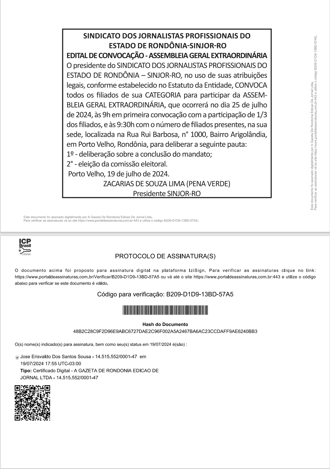 EDITAL DE CONVOCAÇÃO ASSEMBLEIA GERAL EXTRAORDINARIA – SINJOR RO