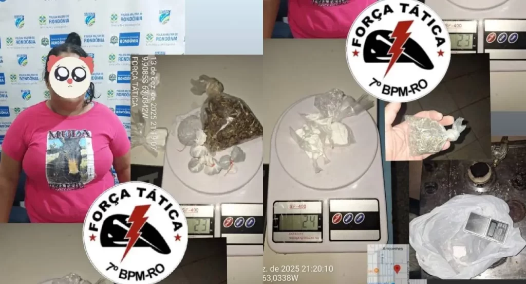 Diante da situação, foram realizadas buscas minuciosas nas dependências do local. Os policiais localizaram sete invólucros de maconha (aproximadamente 23 gramas), oito invólucros de cocaína (cerca de 24 gramas), um invólucro de crack, além de R$ 182 em espécie, uma balança de precisão e um smartphone, itens compatíveis, em tese, com a prática de tráfico de drogas.