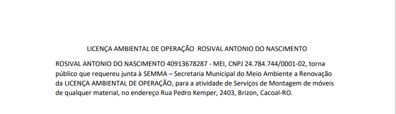 LICENÇA AMBIENTAL DE OPERAÇÃO ROSIVAL ANTONIO DO NASCIMENTO