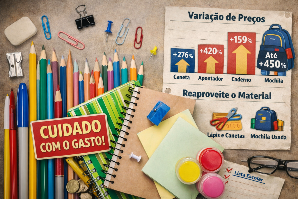 Itens simples, como lápis, canetas, cadernos e apontadores, podem parecer baratos individualmente, mas, quando somados, representam uma fatia significativa do orçamento. O problema se agrava quando os pais compram todos os itens em um único local, sem comparar preços.