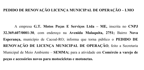 PEDIDO DE RENOVAÇÃO LICENÇA MUNICIPAL DE OPERAÇÃO – LMO – G.T. Motos Peças E Serviços Ltda – ME