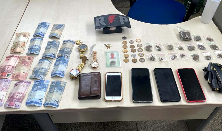 Diante da situação, foi realizada uma busca minuciosa na residência, onde os militares localizaram 13 embalagens de substância entorpecente prontas para comercialização, além de R$ 98,00 em notas de pequeno valor, um drone, relógios, bijuterias e aparelhos celulares de procedência duvidosa, materiais comumente associados à prática do tráfico de drogas.