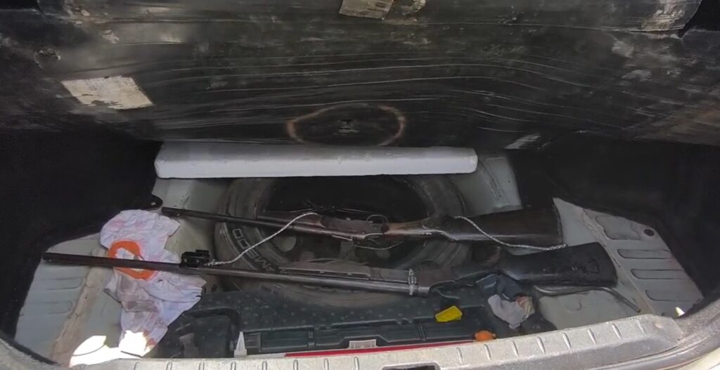 Durante buscas no local, os policiais localizaram duas armas de fogo, sendo uma calibre .32 e outra calibre .22 escondidas no porta malas de um veículo. Também foram apreendidas seis munições calibre .32, sendo uma deflagrada e cinco intactas, além de 20 munições calibre .22 intactas. As armas não possuíam numeração visível, indicando possível supressão de sinal identificador. O acusado não apresentou documentação dos armamentos.