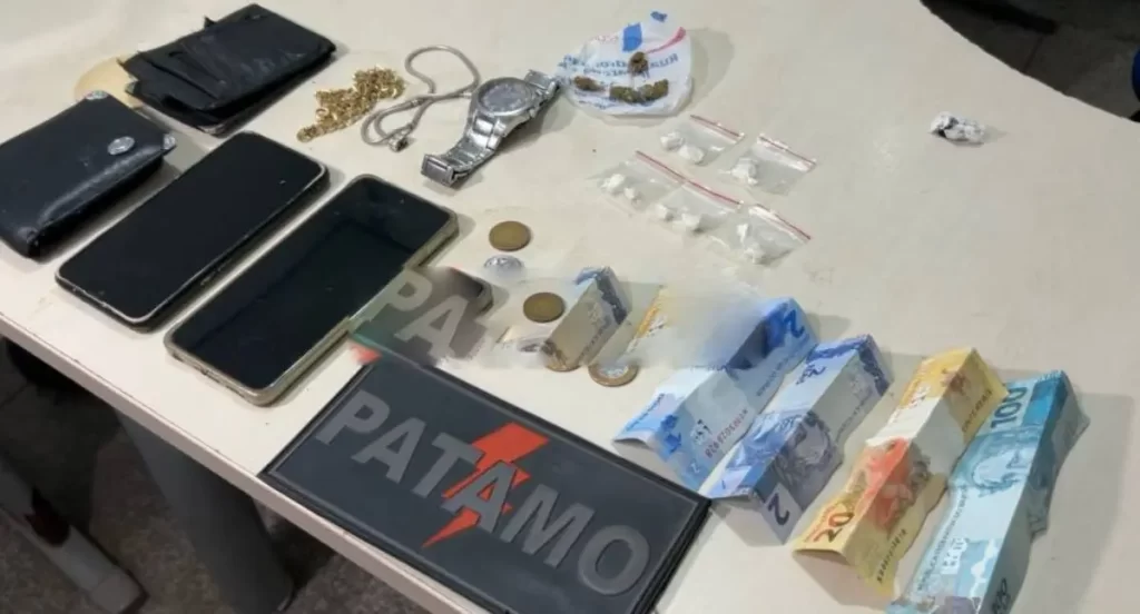 Durante a revista pessoal, os militares encontraram com um dos suspeitos uma porção de substância análoga à maconha e uma quantia em dinheiro trocado, característica comum na venda de entorpecentes. Em uma busca minuciosa no perímetro onde a dupla estava, os policiais localizaram uma carteira de cigarros descartada que escondia 11 pedras de substância com características de cocaína. A proximidade dos objetos com os detidos reforçou a suspeita de que as drogas seriam comercializadas entre os frequentadores da festa.