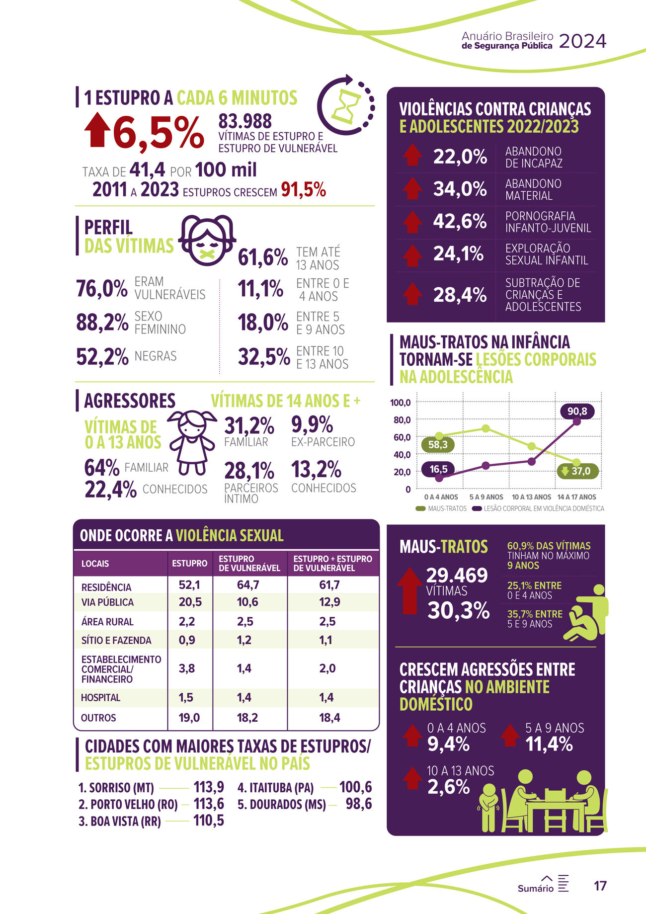 De acordo com o estudo publicado pelo Anuário, o Brasil registrou um estupro a cada seis minutos em 2023, totalizando 83.988 casos de estupros e estupros de vulneráveis, um crescimento de 6,5% em relação a 2022. Os dados mostram ainda que as mulheres são a maioria das vítimas. Os crimes acontecem mais no ambiente familiar, mostra o estudo. O anuário mostrou, também, números da série histórica entre 2011 e 2023, que aponta um crescimento de 91,5% na incidência de estupros no Brasil.
