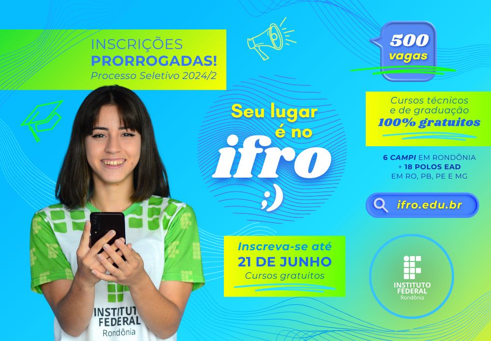 As inscrições para o Instituto Federal de Educação, Ciência e Tecnologia de Rondônia (Ifro) para o segundo semestre de 2024 foram prorrogadas. No total, existem 500 vagas em cidades em Rondônia e em polos em Minas Gerais, Paraíba e Pernambuco. As inscrições podem ser feitas até nos finais de semana e feriados, por meio do sistema de inscrição on-line até às 23h59 do dia 21 de junho de 2024.