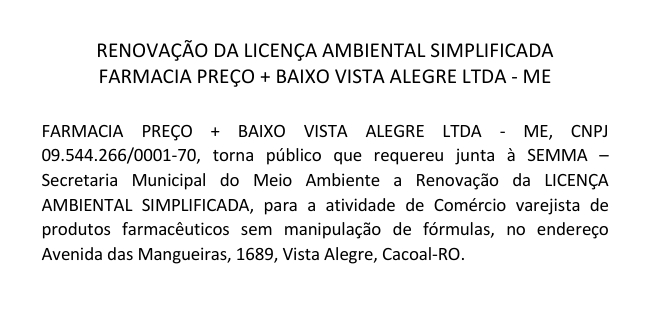 RENOVAÇÃO DA LICENÇA AMBIENTAL SIMPLIFICADA FARMACIA PREÇO + BAIXO VISTA ALEGRE LTDA – ME
