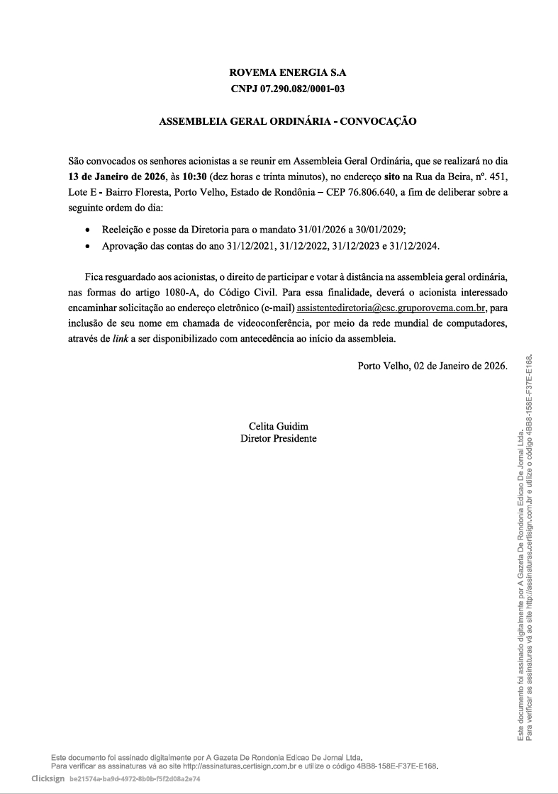 Rovema Energia S.A. EDITAL DE CONVOCAÇÃO ASSEMBLEIA GERAL ORDINÁRIA