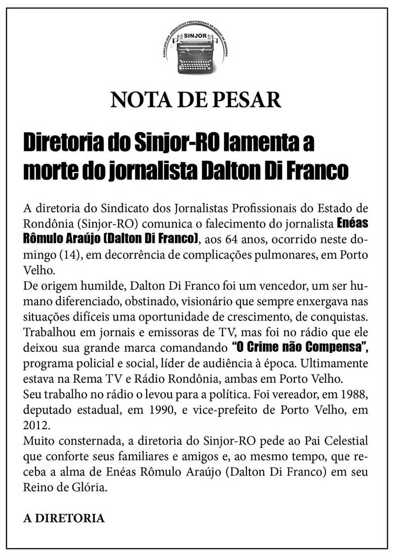 Sinjor lamenta a morte do jornalista Dalton Di Franco